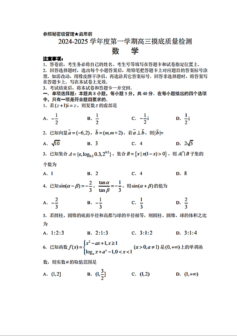 山东省淄博市2024-2025学年第一学期高三期末摸底质量检测数学