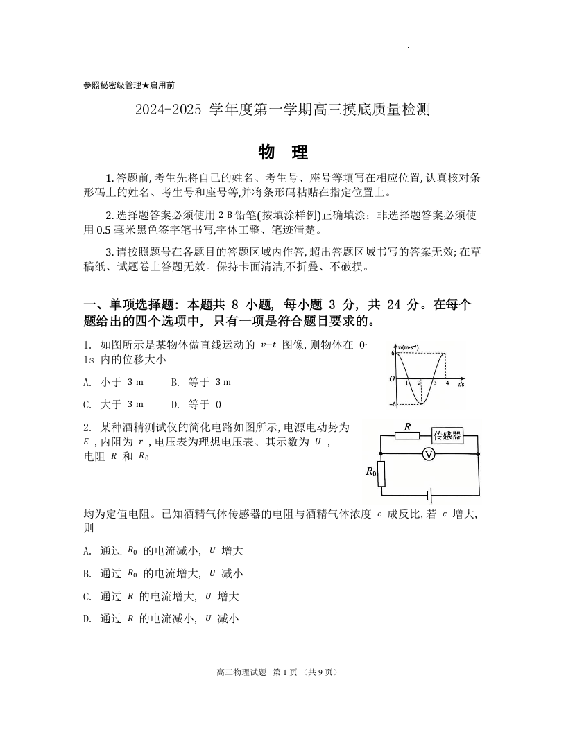 山东省淄博市2024-2025学年第一学期高三期末摸底质量检测物理
