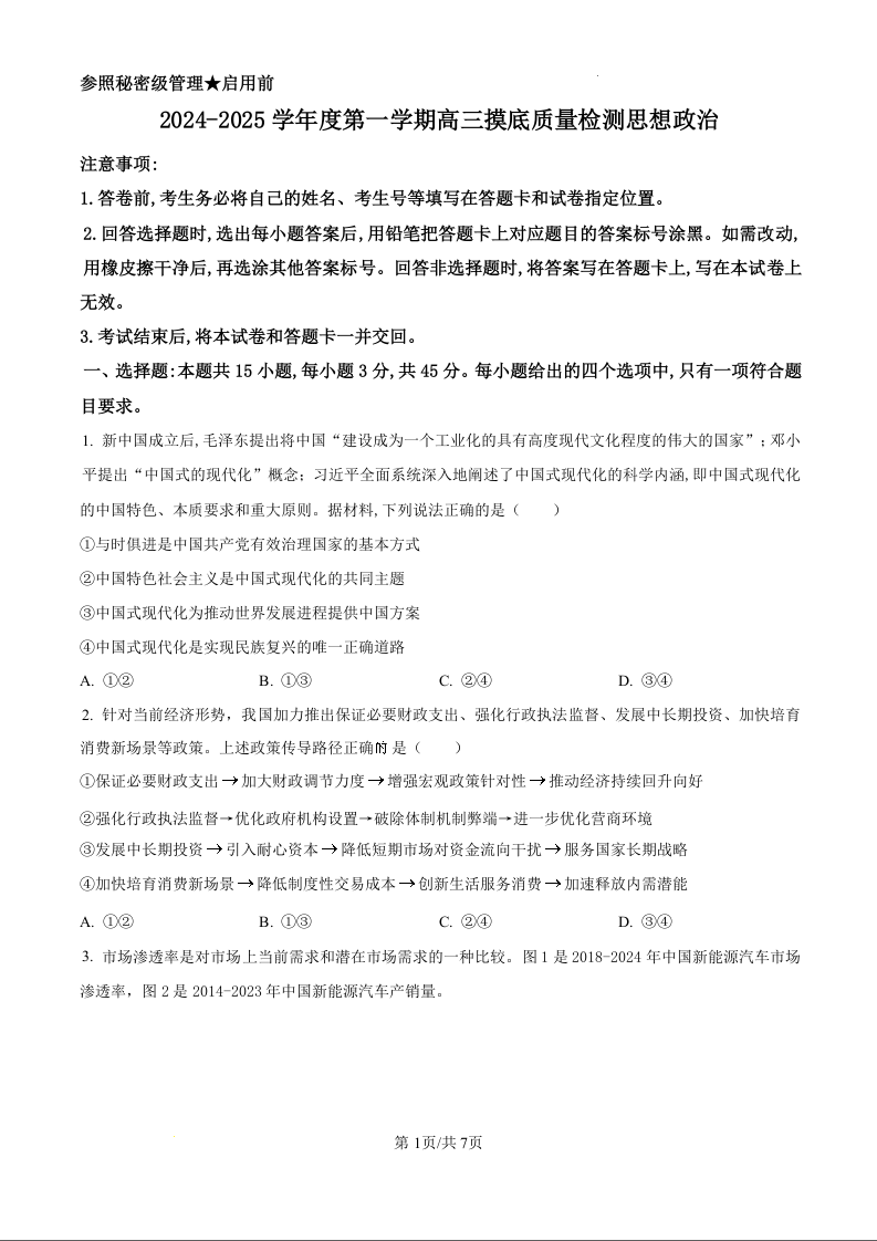山东省淄博市2024-2025学年第一学期高三期末摸底质量检测政治(原卷版)