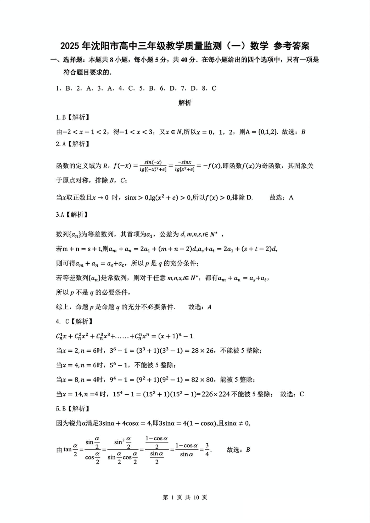 辽宁省沈阳市2025年高中三年级教学质量监测(一模)数学答案