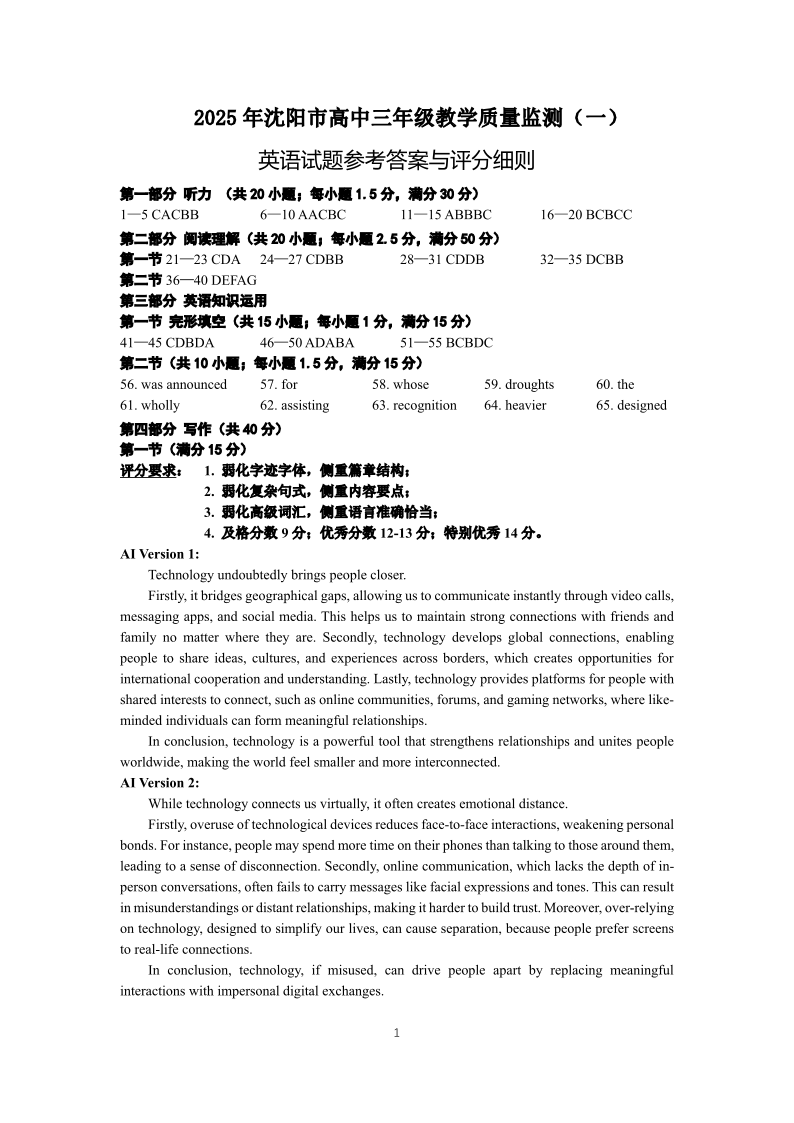 辽宁省沈阳市2025年高中三年级教学质量监测(一模)英语答案