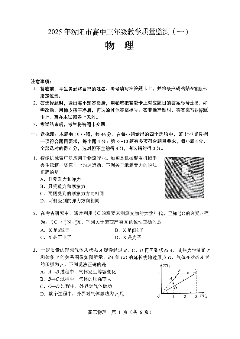 辽宁省沈阳市2025年高中三年级教学质量监测(一模)物理