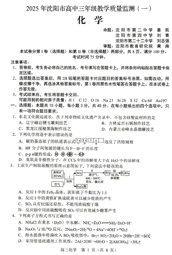 辽宁省沈阳市2025年高中三年级教学质量监测(一模)化学