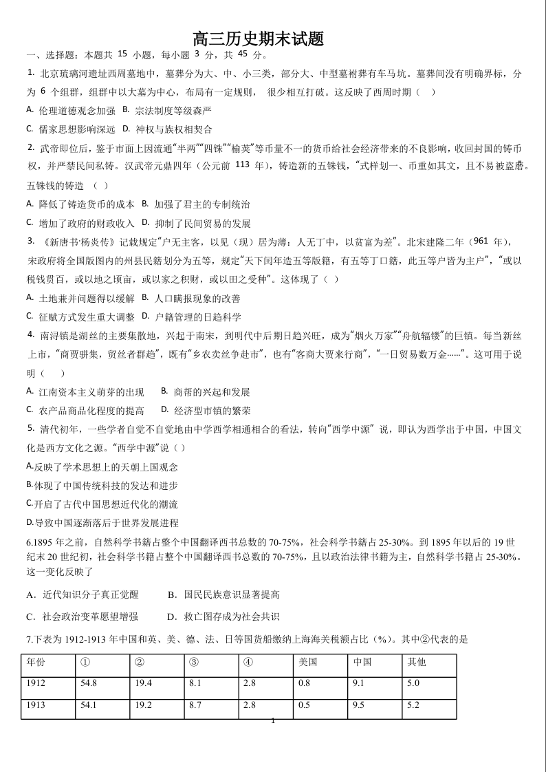 吉林省通化市梅河口市第五中学2025届高三上学期1月期末考试历史+答案