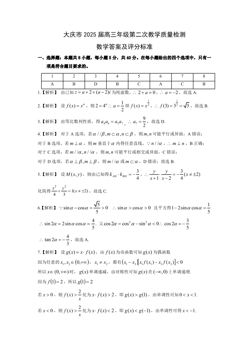 黑龙江省大庆市2025届高三年级第二次教学模拟质量检测数学答案