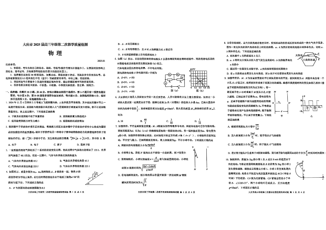 黑龙江省大庆市2025届高三年级第二次教学模拟质量检测物理