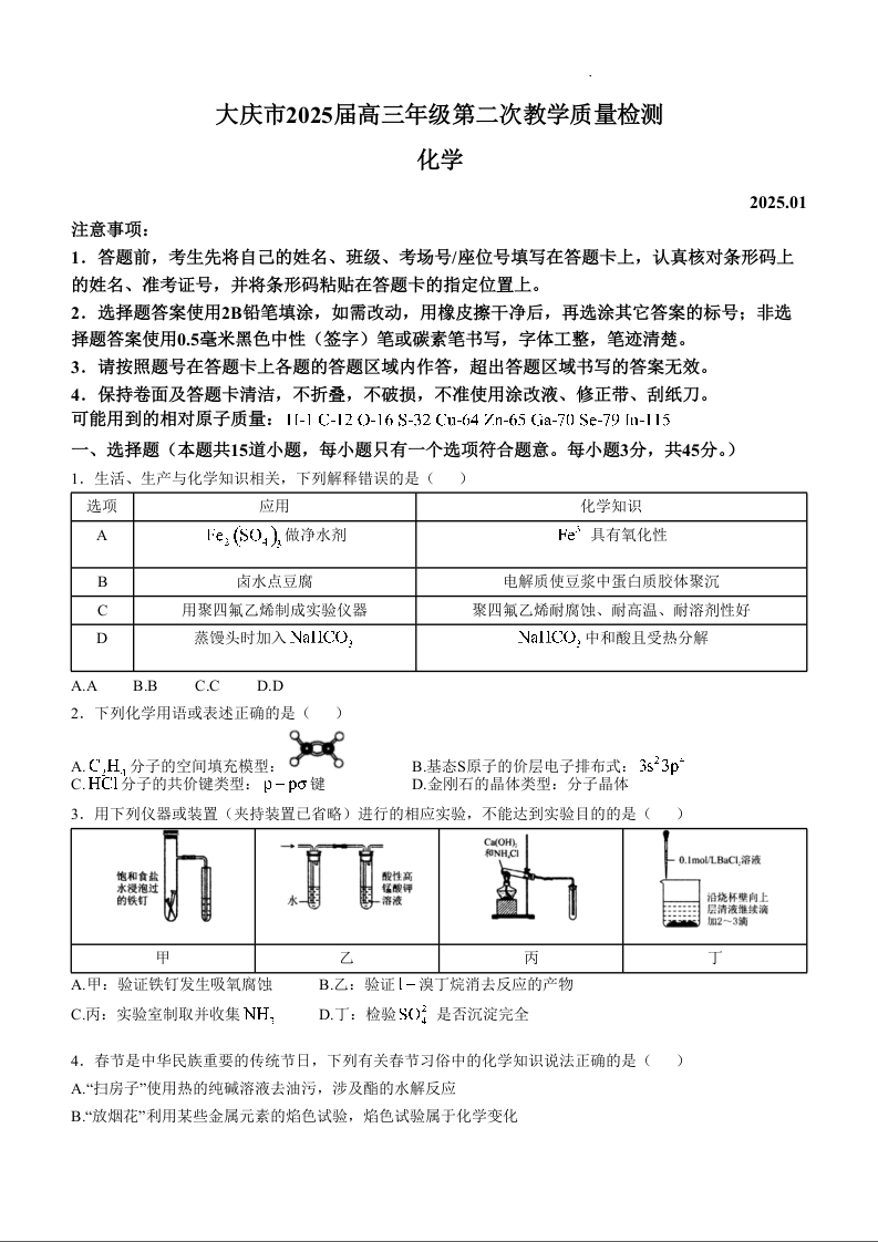 黑龙江省大庆市2025届高三年级第二次教学模拟质量检测化学