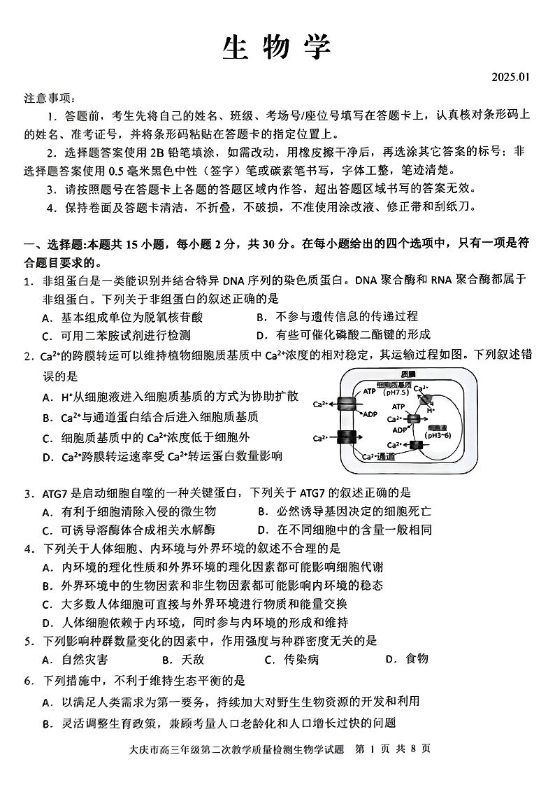 黑龙江省大庆市2025届高三年级第二次教学模拟质量检测生物