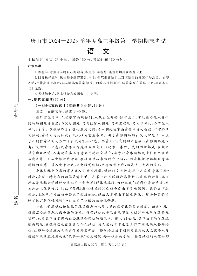 河北省唐山市2025届高三上学期1月期末考试语文+答案