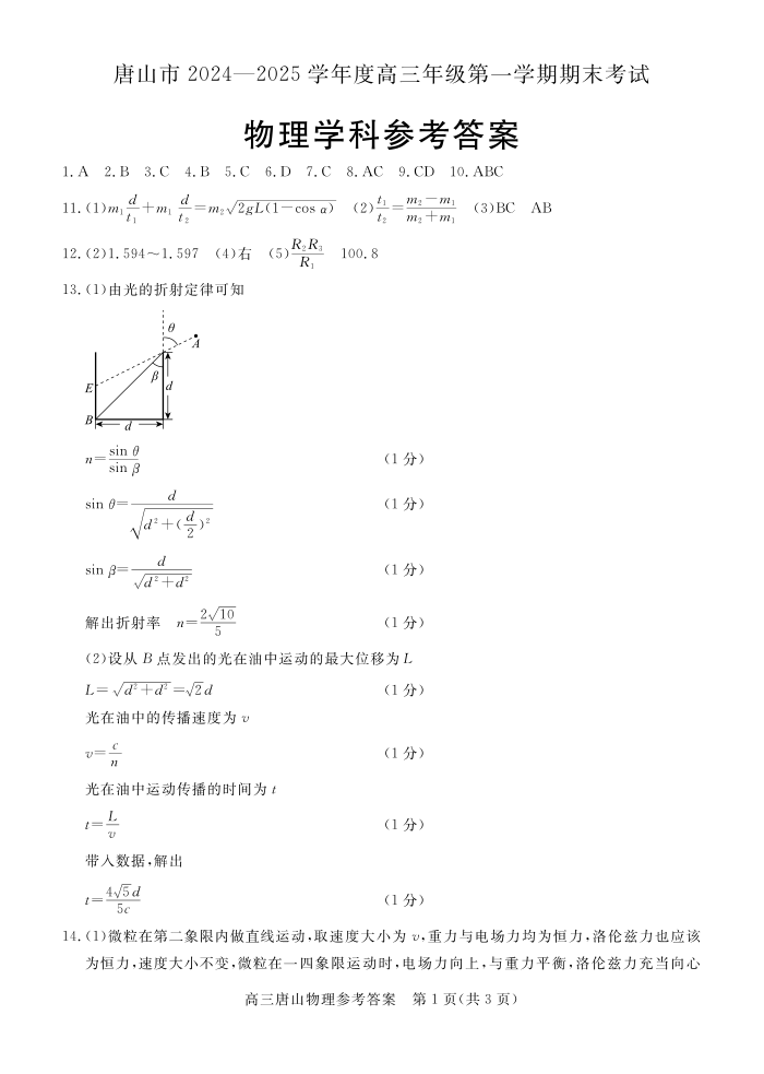 河北省唐山市2025届高三上学期1月期末考试物理答案