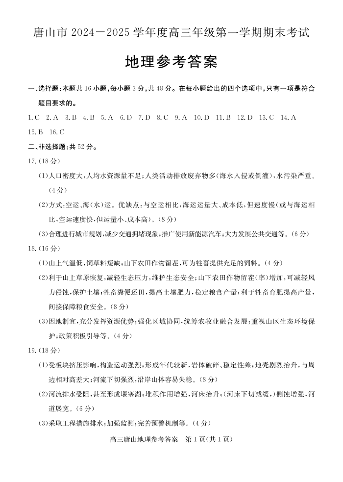 河北省唐山市2025届高三上学期1月期末考试地理答案