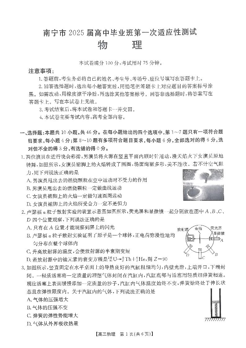 广西南宁市及跨区域高中2025届年高中毕业班第一次适应性模拟物理