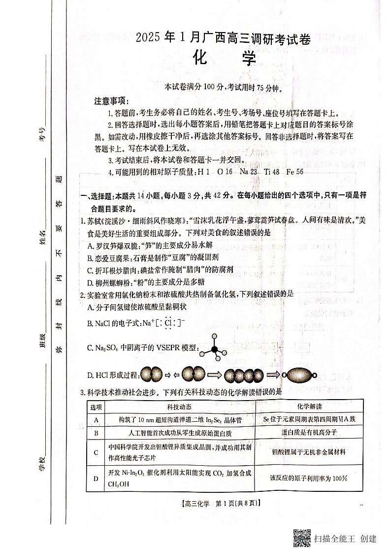 广西南宁市及跨区域高中2025届年高中毕业班第一次适应性模拟化学