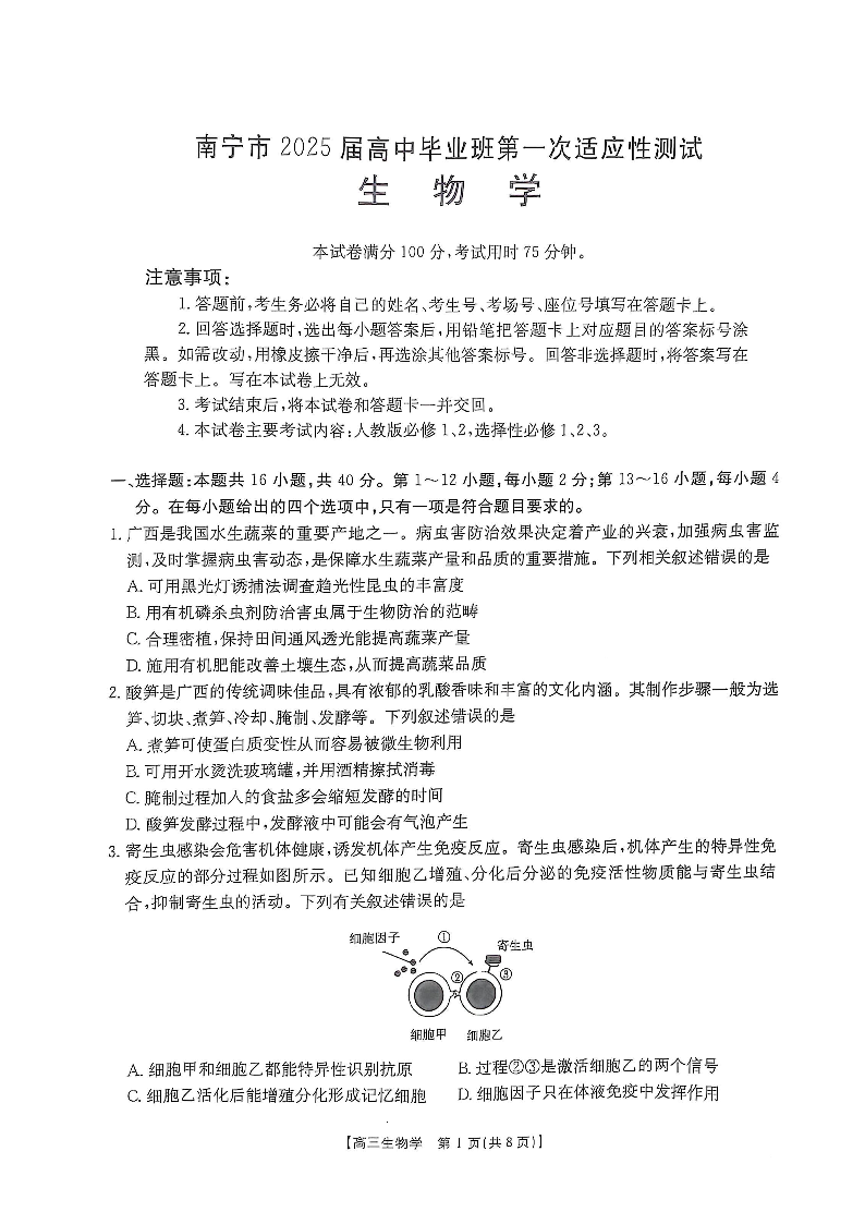 广西南宁市及跨区域高中2025届年高中毕业班第一次适应性模拟生物