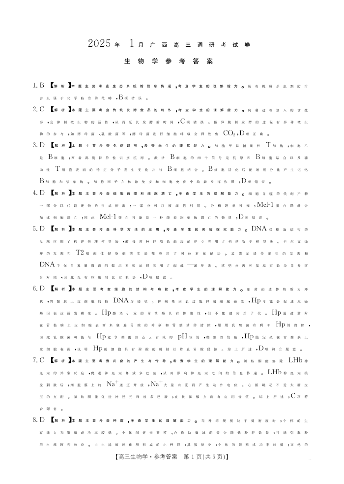 广西南宁市及跨区域高中2025届年高中毕业班第一次适应性模拟生物答案
