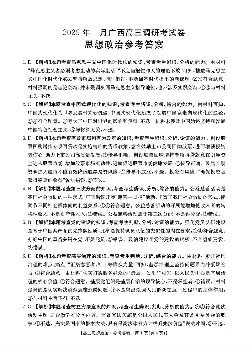 广西省南宁市及跨区域高中2025届年高中毕业班第一次适应性模拟政治答案