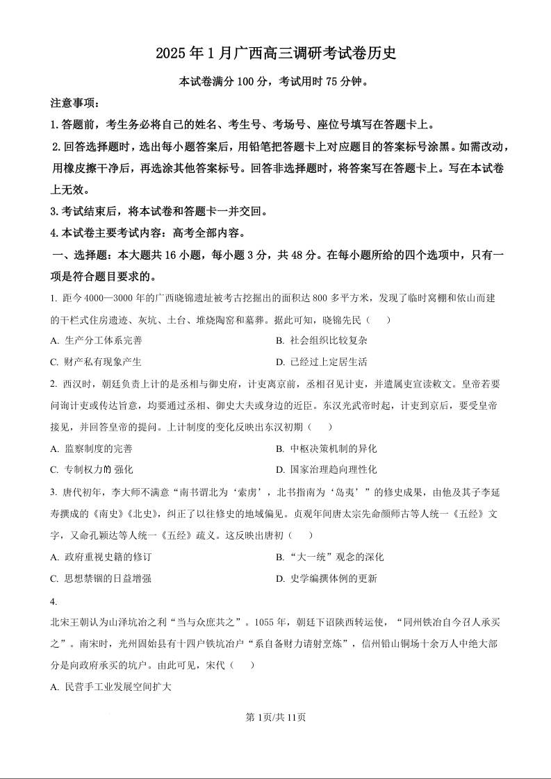 广西南宁市及跨区域高中2025届年高中毕业班第一次适应性模拟历史+答案