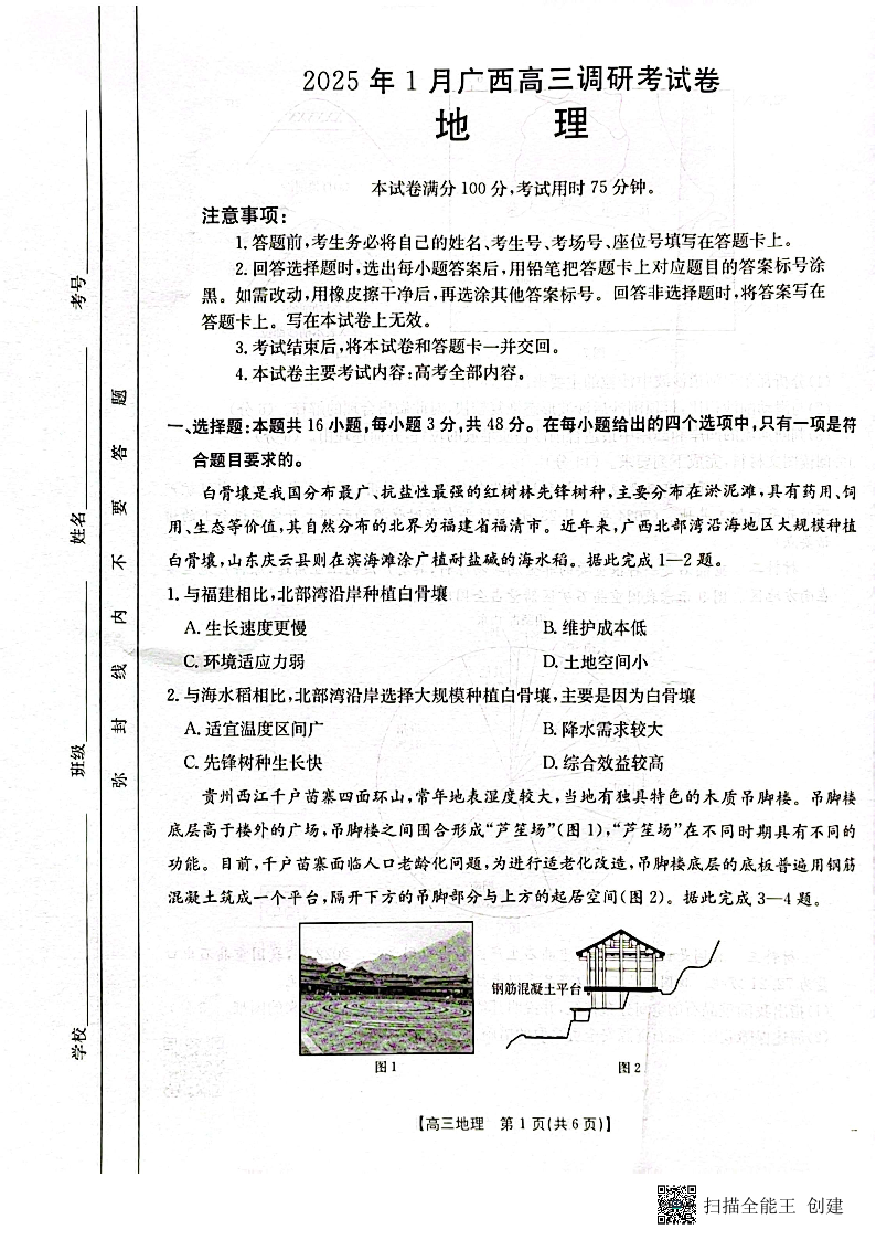 广西南宁市及跨区域高中2025届年高中毕业班第一次适应性模拟地理