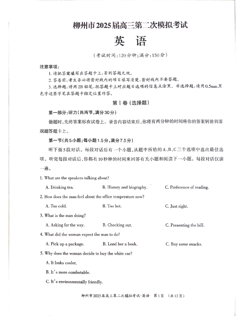 广西省柳州市2025届高三第二次模拟考试(二模)英语