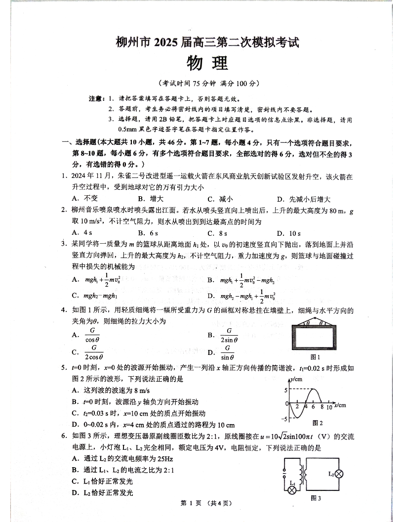 广西省柳州市2025届高三第二次模拟考试(二模)物理