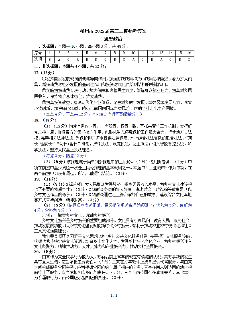 广西省柳州市2025届高三第二次模拟考试(二模)政治答案