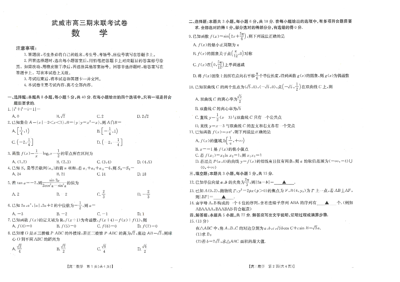 甘肃省武威市2025届高三上学期1月期末联考数学