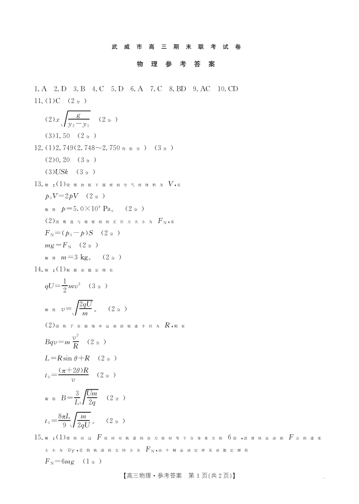甘肃省武威市2025届高三上学期1月期末联考物理答案