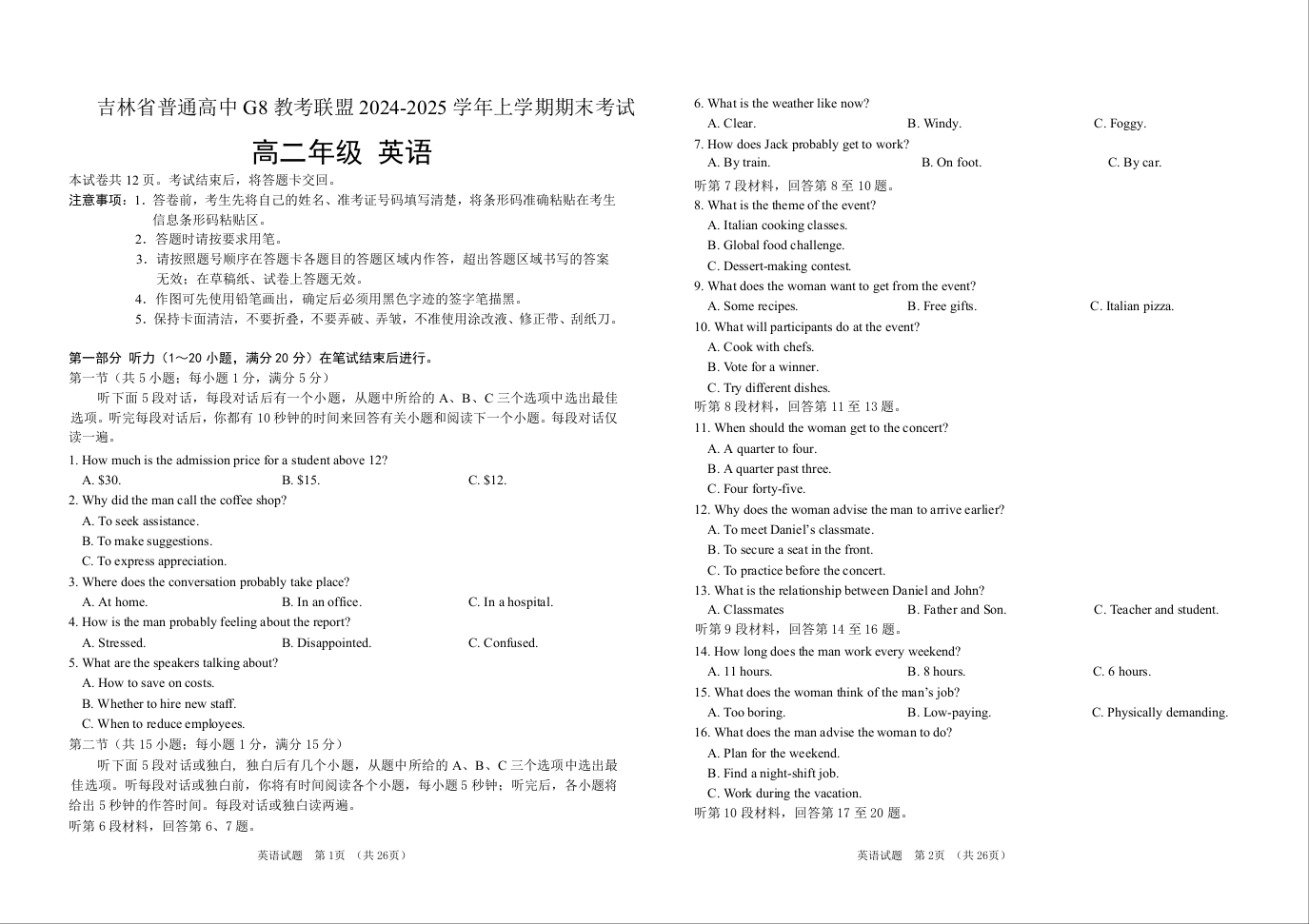 吉林省普通高中G8教考联盟2024-2025学年高二上学期期末考试英语+答案