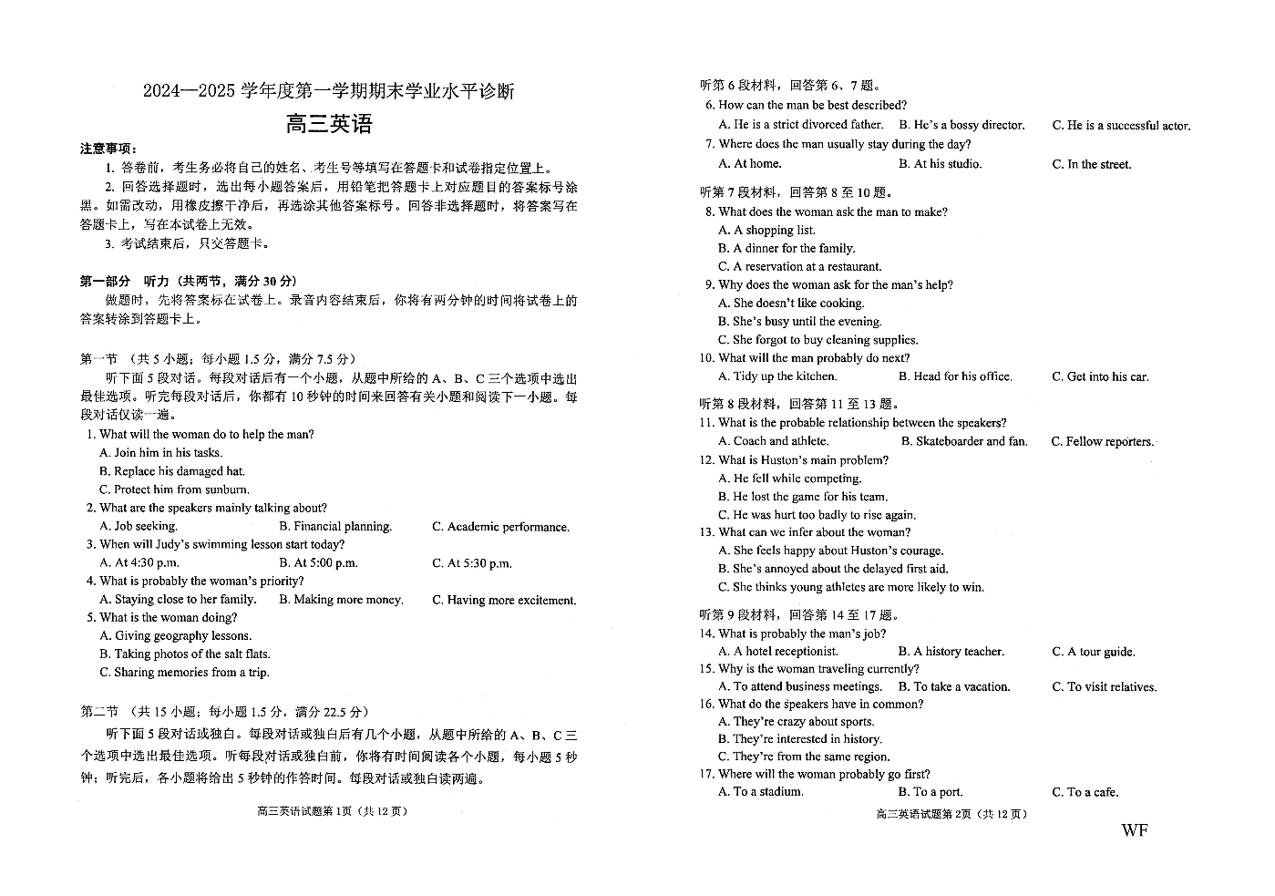 山东省烟台市2024-2025学年第一学期高三期末学业水平诊断英语