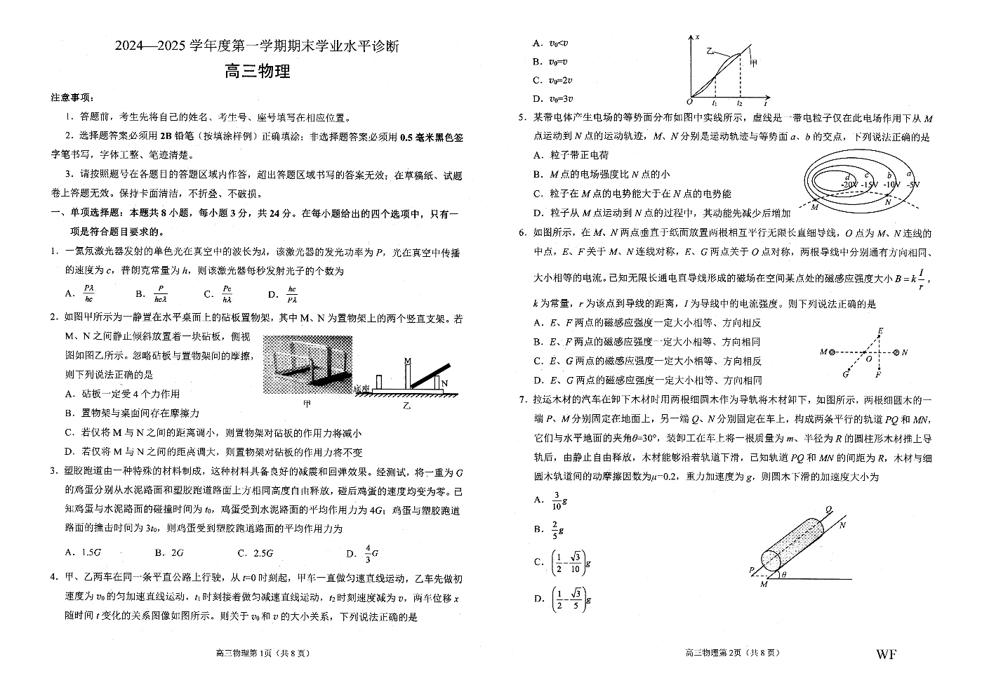 山东省烟台市2024-2025学年第一学期高三期末学业水平诊断物理