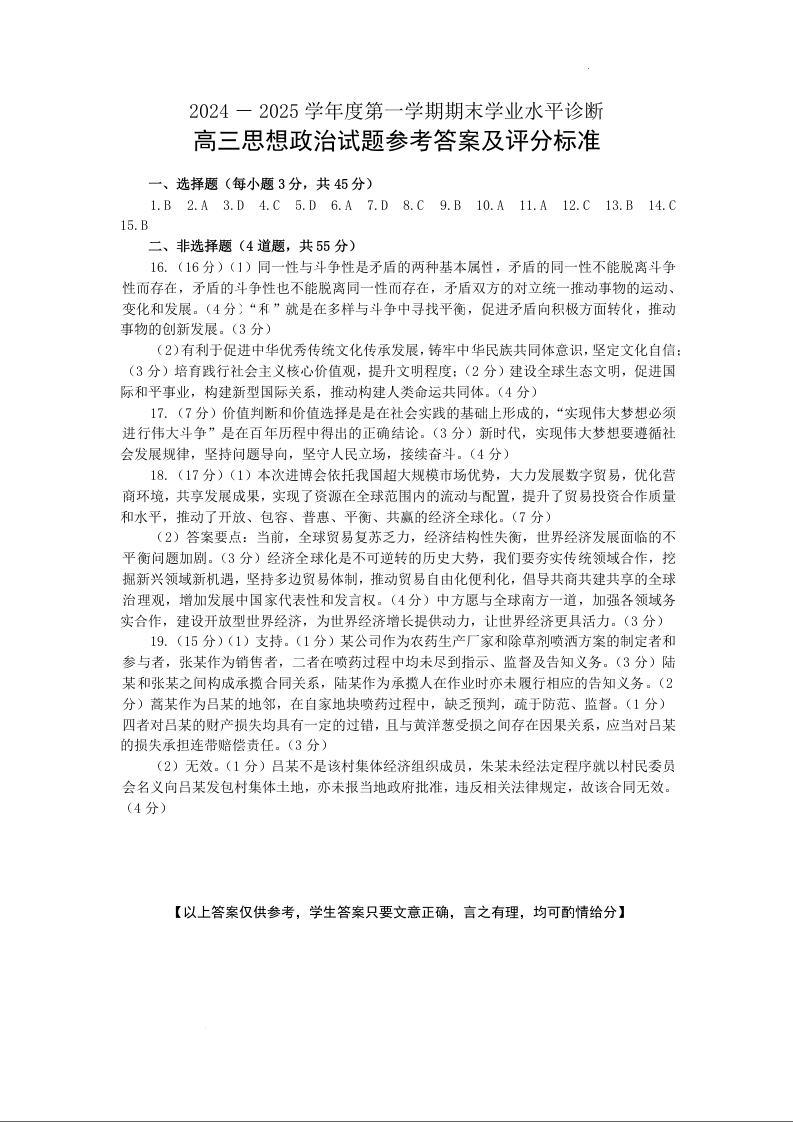 山东省烟台市2024-2025学年第一学期高三期末学业水平诊断政治答案