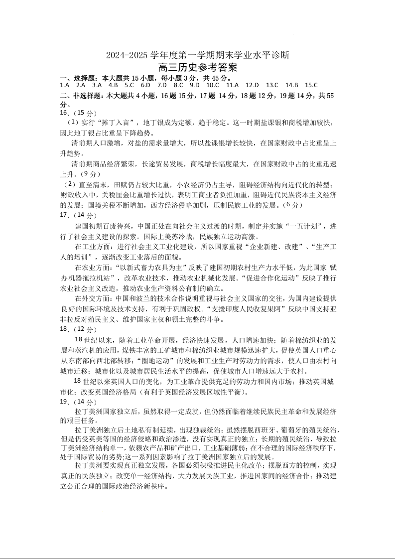 山东省烟台市2024-2025学年第一学期高三期末学业水平诊断历史答案