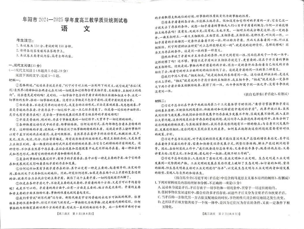 安徽省阜阳市2025届高三上学期1月期末教学质量统测语文+答案