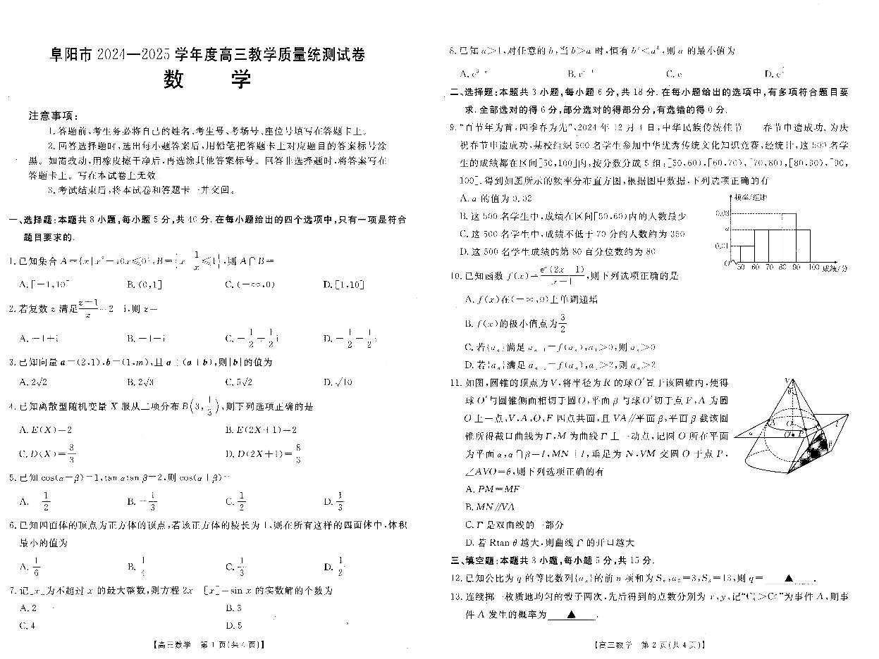 安徽省阜阳市2025届高三上学期1月期末教学质量统测数学+答案