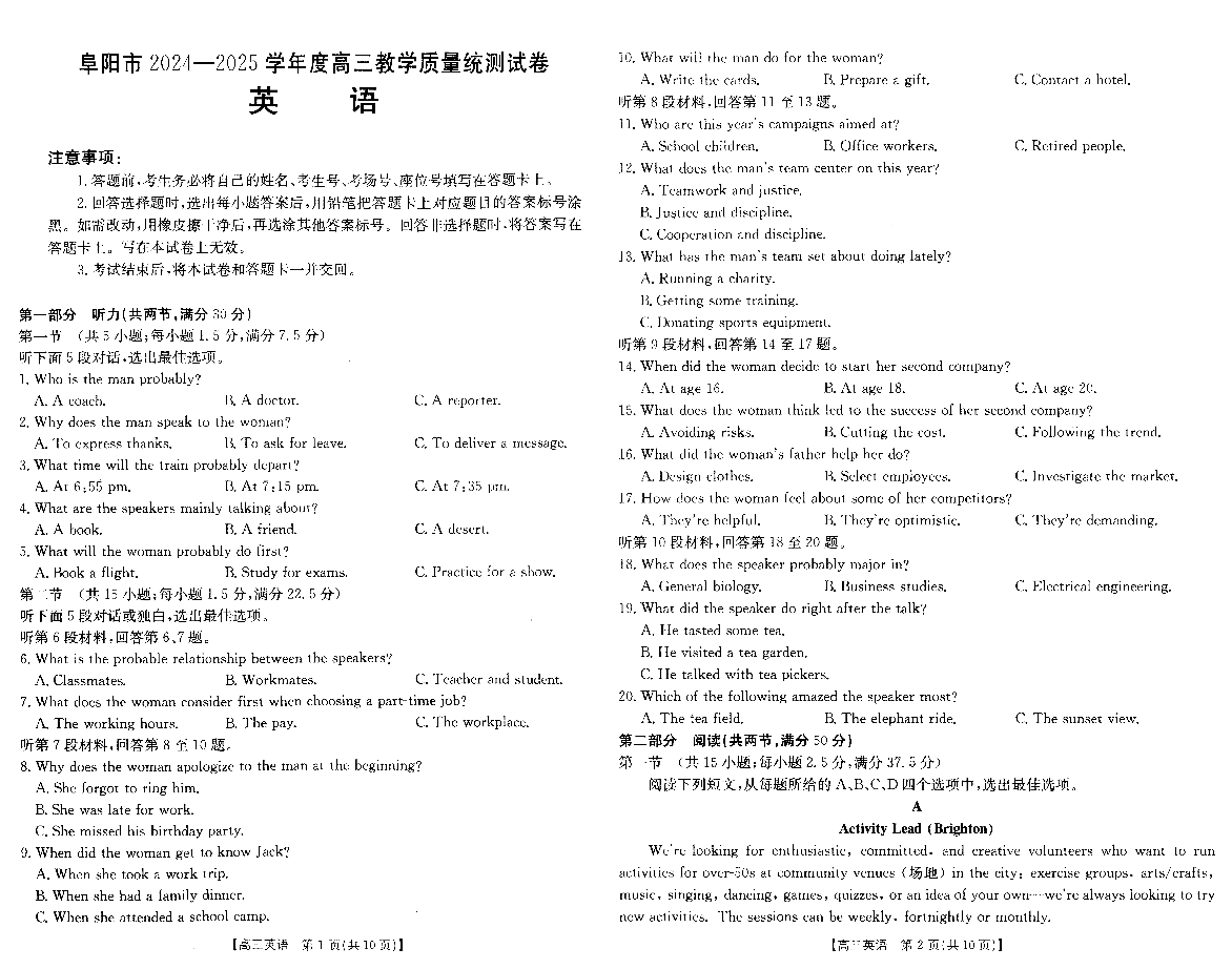 安徽省阜阳市2025届高三上学期1月期末教学质量统测英语+答案