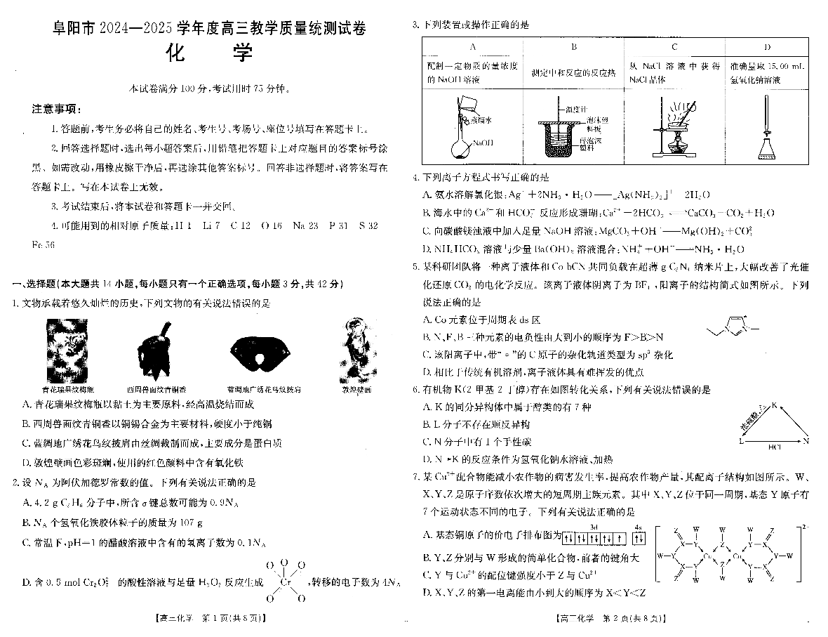 安徽省阜阳市2025届高三上学期1月期末教学质量统测化学+答案