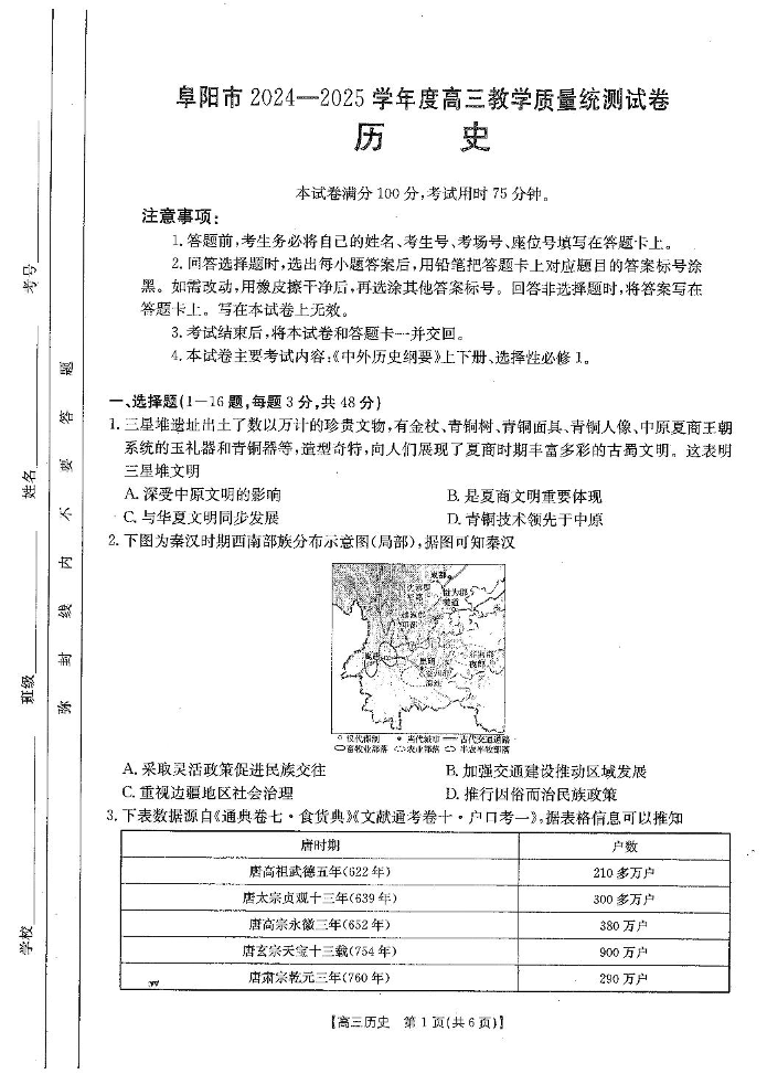 安徽省阜阳市2025届高三上学期1月期末教学质量统测历史+答案