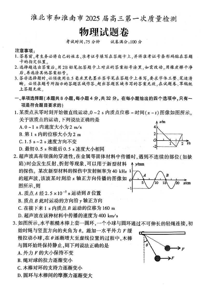 安徽省淮南市和淮北市2025届高三上学期第一次质量检测物理