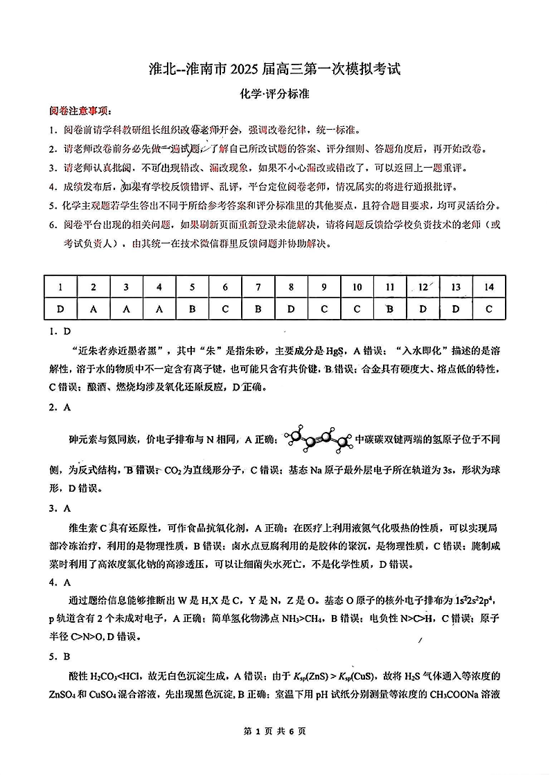 安徽省淮南市和淮北市2025届高三上学期第一次质量检测化学答案