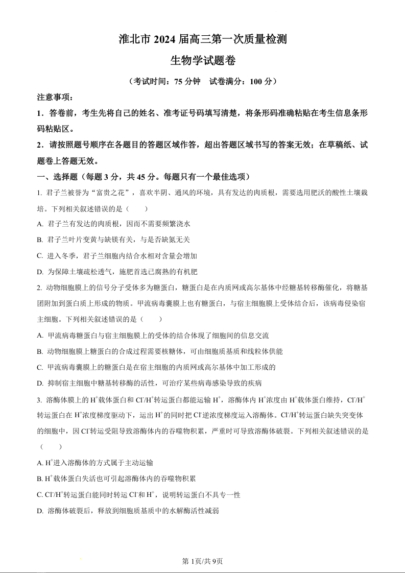 安徽省淮南市和淮北市2025届高三上学期第一次质量检测生物(原卷版)