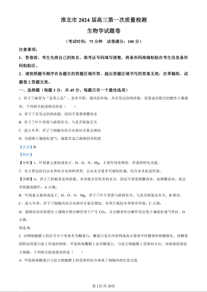 安徽省淮南市和淮北市2025届高三上学期第一次质量检测生物(精品解析版)