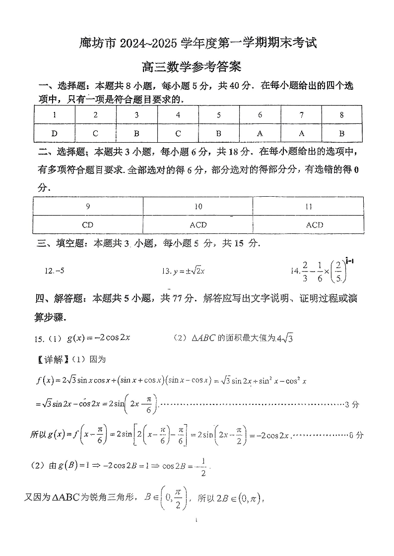河北省廊坊市 2025届高三上学期1月期末考试数学答案