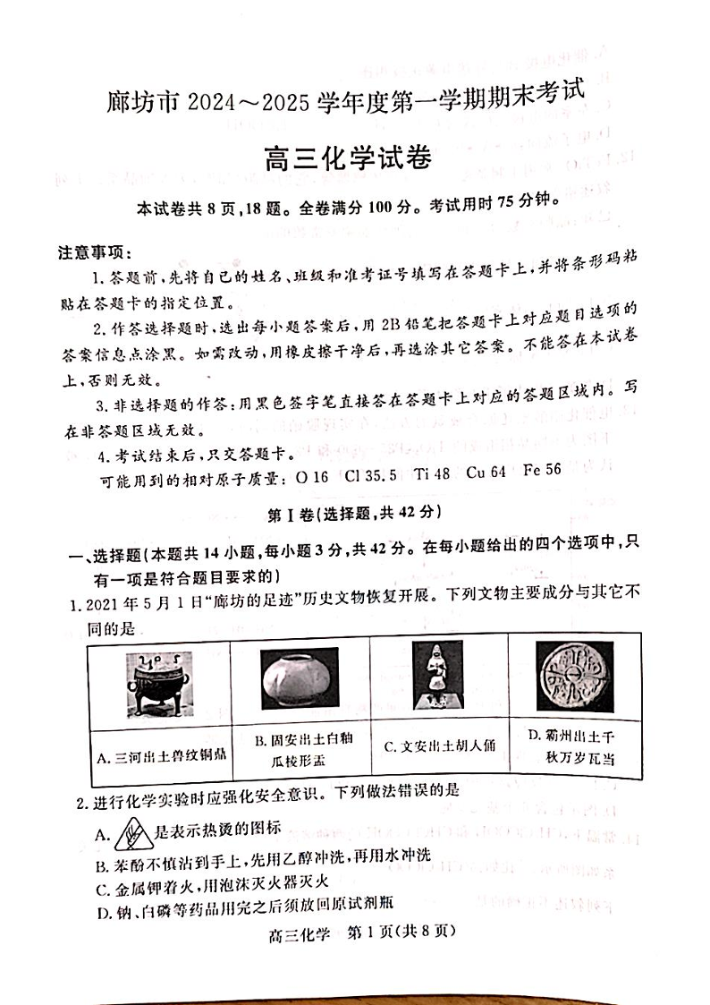 河北省廊坊市 2025届高三上学期1月期末考试化学