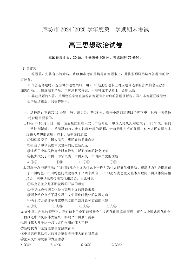 河北省廊坊市 2025届高三上学期1月期末考试政治