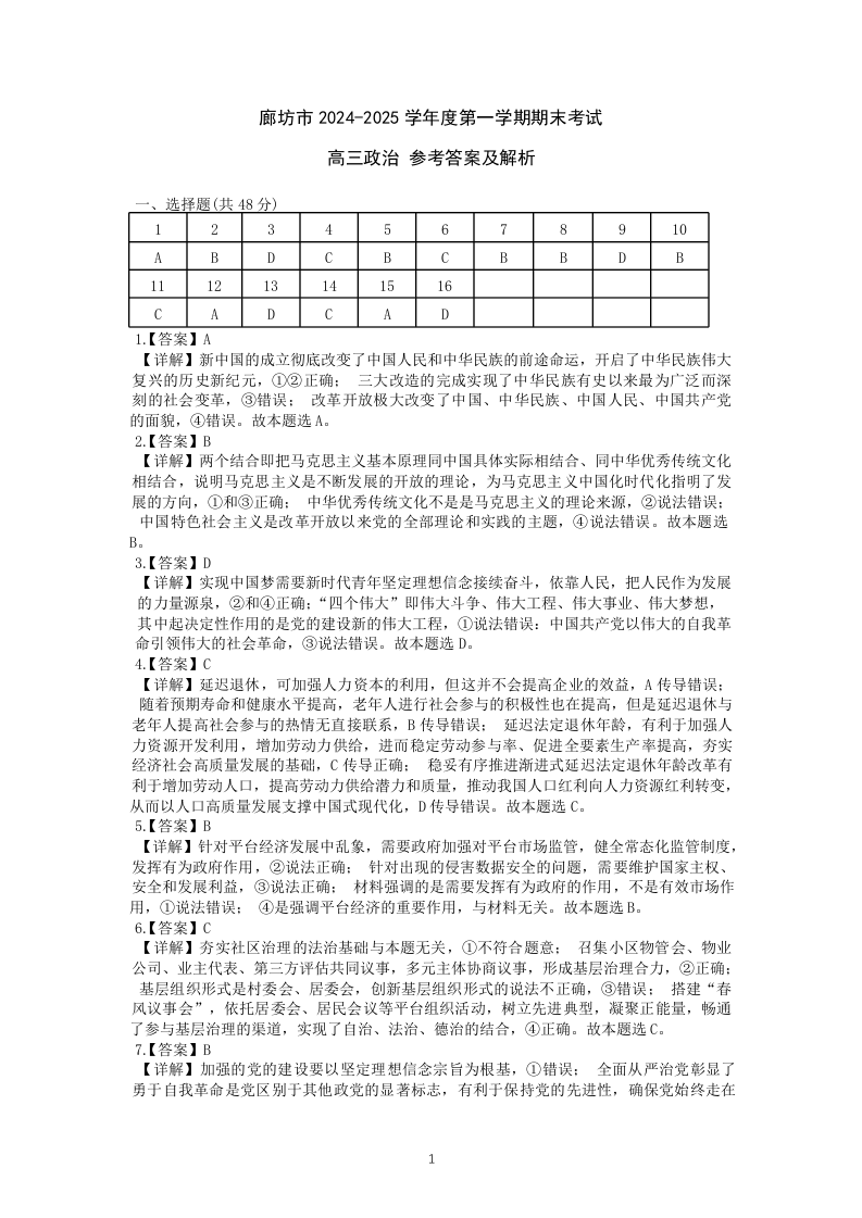 河北省廊坊市 2025届高三上学期1月期末考试政治答案