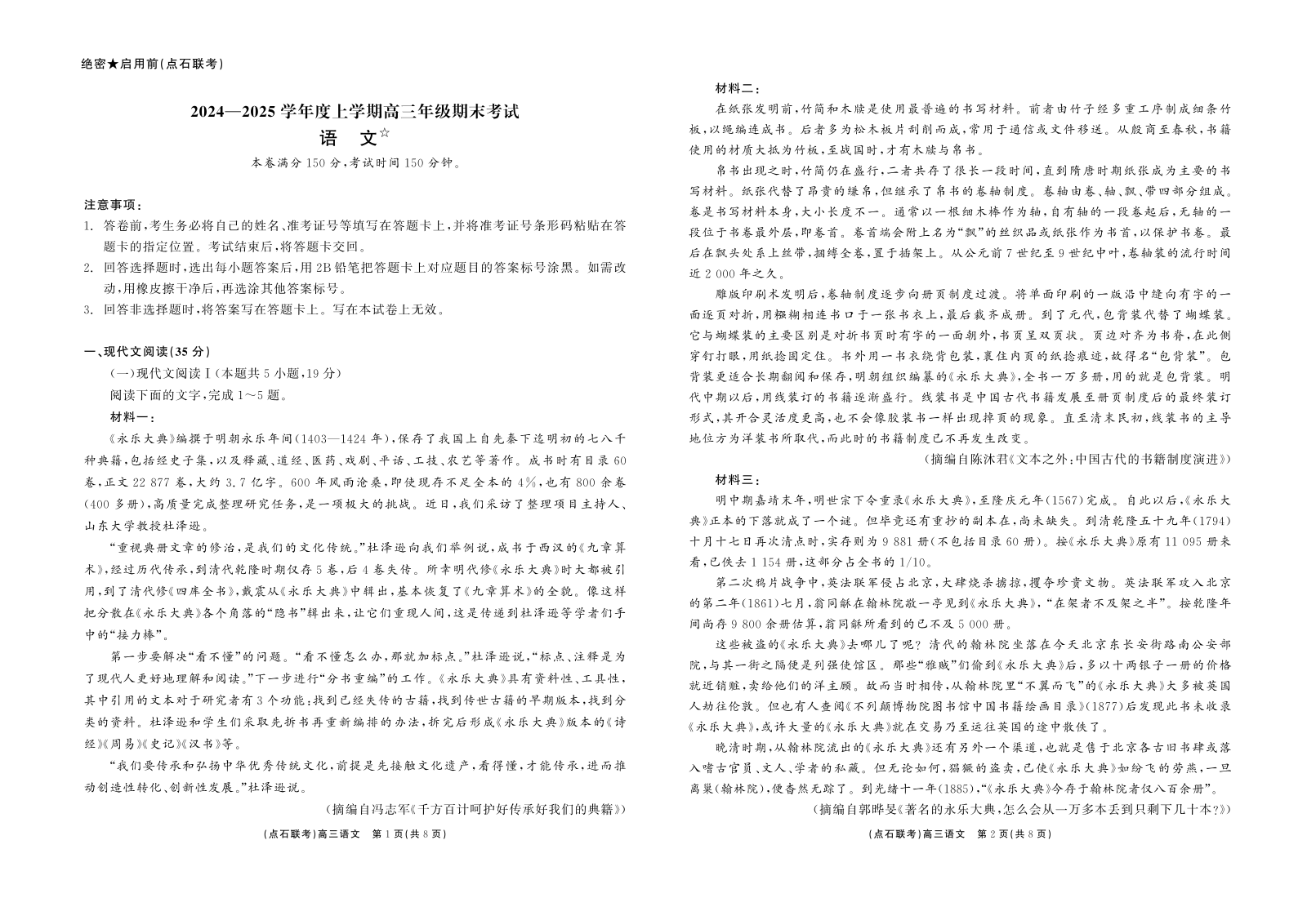 辽宁省点石联考2025届高三上学期1月期末考试语文