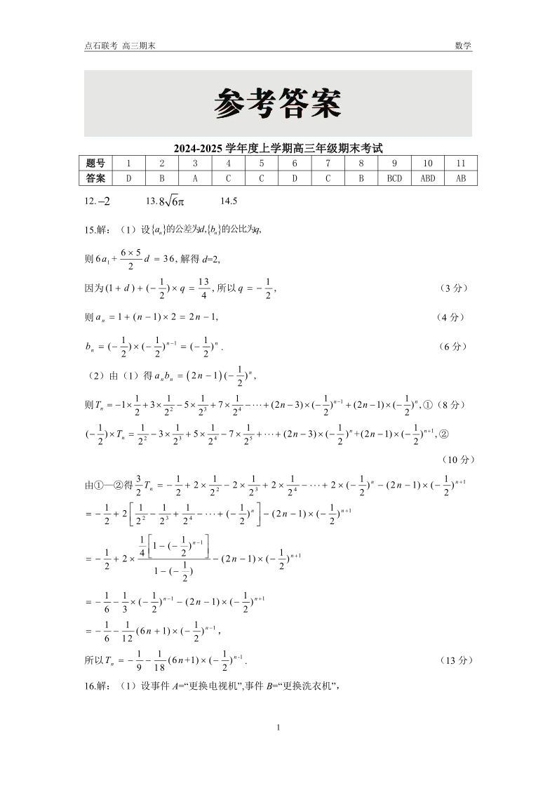 辽宁省点石联考2025届高三上学期1月期末考试数学答案