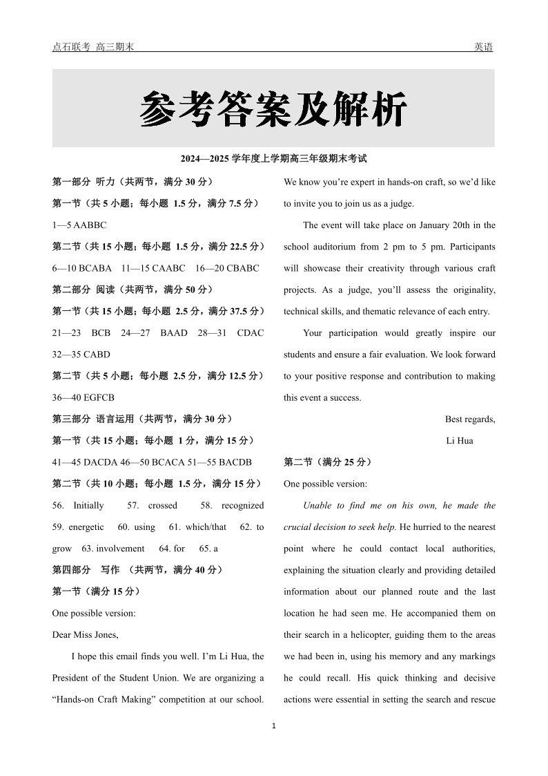 辽宁省点石联考2025届高三上学期1月期末考试英语答案