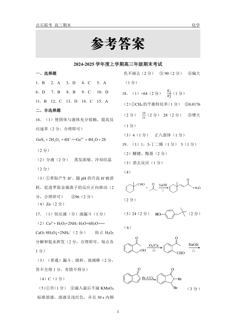 辽宁省点石联考2025届高三上学期1月期末考试化学答案