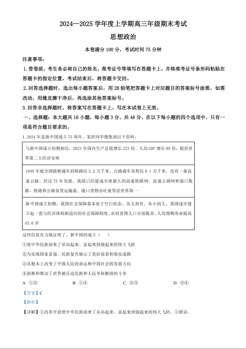 辽宁省点石联考2025届高三上学期1月期末考试政治(精品解析版)
